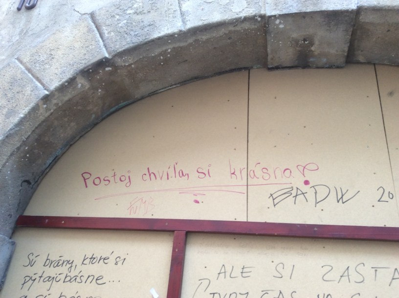 Postoj chvila, si krasna is written on this door in the old town of Bratislava. Stop for a minute, you’re beautiful. In Slovak it’s clear the request is meant for female ears 🙂I want to be like your first cup of coffee in the morning, get a message from you wishing me good night, live years of glory with you, be your joint full of pot.Money is an instrument of Satan. The gate seems to teach economics 101.There are gates that ask for poems and there are poems that want to be on gates.If you speak Dutch it can be quite a surprise to see a bar named ‘kut’. In Slovak it means ‘corner’, but in Dutch it means ‘cunt’.The interior is red and rosy, the lights are dimmed, there’s a cozy couch and the tables are round (from a psychological point of view round tables are better, they let you bond more easily). Abandon all worries yee who enter cafe kut.