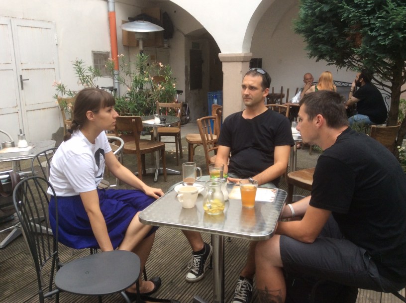 We met in a bar called The Next Apache. The walls inside are lined with rows and rows of novels, which you can buy at reasonable prices. Today we sat outside, even though it looked like it was going to rain.