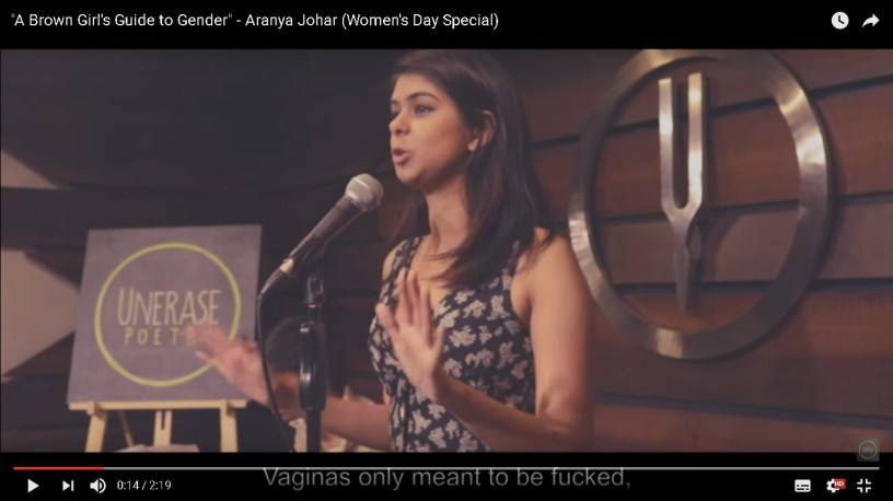 ‘The first boy who held my hand told me boys didn’t want to hear about vaginas bleeding. Younger me could smell the misogyny. Vaginas only meant to be fucked, breasts only meant to be sucked, mouths only meant to blow. It’s true, I know. My waist meant to be compared to an hour glass. My voice only meant to quiver, ‘Ugh, please, fast.’ Yet, I am silenced. For all we boil down to is sexual interaction. Not just me, my mother, sisters, friends, all quicken their pace post 8.30 in the evening. My mom telling me to wear skirts out less often. Nirbhaya and more, left forgotten. We don’t want to be another of India’s daughters, do we? So I wear my jeans long and wear my tops high. Don’t show my cleavage or a hint of my thighs. Don’t want to be mistaken for wanting it. Cause if I wear less, I’m more than just flaunting it, I’m risking it. Risking not my virginity, but my life. My hymen seems to be sacred, told to keep it till I’m a wife. If not, I’m a whore, a slut, a skank and more. Not as pure as I was before. 15 year old Laxmi didn’t like 32 year old Guddu back and Guddu dealt with it real maturely, he made her the victim of an acid attack. Laxmi could be your sister, your girlfriend, your cousin. We’re girls, women, human, not a burden. I ask my male friend to drop me home because his privilege will protect mine. I’m sorry dad, for I was catcalled in my uniform at the age of 9. This isn’t an all men thing I know. Trust me, I do. But the men I can trust are only a few. At the age of 12 my bra straps were sexualized. At the same time, we don’t get damn sexual rights. My aunt raped by her husband, but marital rape is fine. Pucker up, it’s a mad design, get in line. So what I’m trying to say here tonight is, I’m sorry I was brought up in a family where my brother taught me wrong from right. Where my mother believes in our generation to better the world. Make it slightly easier for each and every girl. Thank you. For I see men in this room. Reaching out for help, realizing the bane of the womb. Being saved by the sane of a few. We’re all collectively reaching out for you. Thank you.’