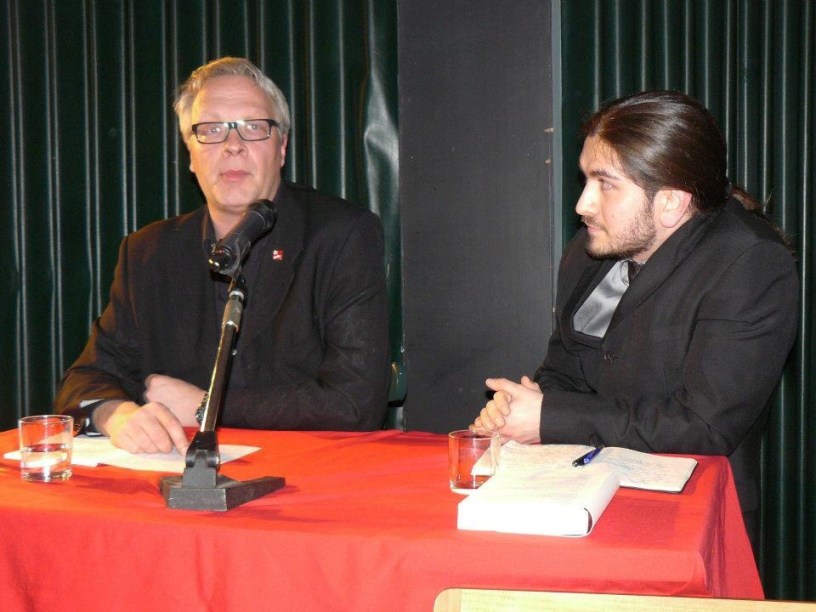 In the featured picture you see comrade Peter Mertens, the boss of the Belgian Pvda, on the right you see little old me. Below you see me speeching at a party event, and not taking the whole thing too seriously judging from my facial expression…