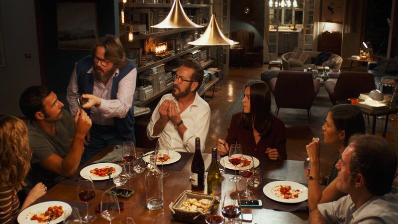 Friends get together for a dinner party. One has a bright idea to spice things up. All phones on the table and everybody gets to read and hear every message that any of them receive.