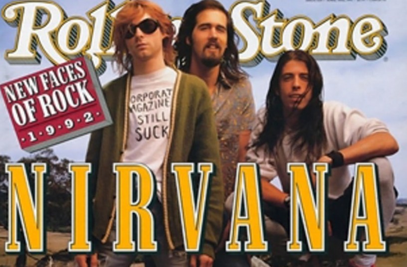When the band kinda rolls out of their little van on the day of the shoot, Kurt is not only wearing a T-shirt with writing on it, it also reads: ‘Corporate magazines still stuck’