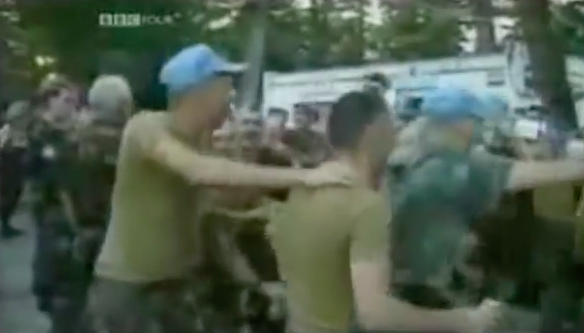 Here Karremans is captured on video joking about prostitution in the Netherlands while dealing with these actors. Based on the short video these actors behave pretty much like the Serbs did in reality. Clearly Karremans – contrary to the instructions he got – decided for himself that the best way to deal with the enemy was to fake a jovial kind of camaraderie hoping to put them at ease and getting favorable terms… Official doctrine was to keep a formal distance in these situations.