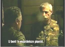 He comes across as the leader of a group of boy scouts that ended up where they had no business. Some of his remarks during the conversation are particularly clumsy. When Mladic angrily berates him for having had the audacity of shooting at the Serb soldiers Karremans says he’s just the piano player. ‘Don’t shoot the piano player’. Mladic utterly humiliates him and throws this snappy retort in his face. ‘A lousy piano player you are!’.