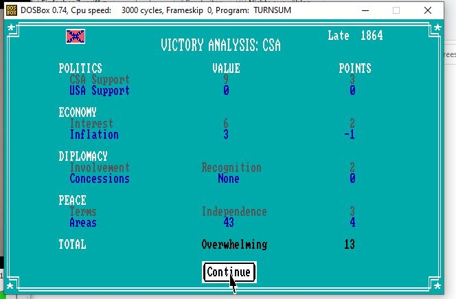 I have also often tried to conquer the entire USA with the CSA. This is tricky because the USA surrenders automatically after it loses a specific combination of cities. So you have to make sure the USA gets to keep one of those cities until you are able to conquer all its remaining cities in one turn. Plus, you have to do this before Lincoln loses the election in 1864 OR you have to play badly on purpose for a while so Lincoln does win the election and you have more time to conquer every city.