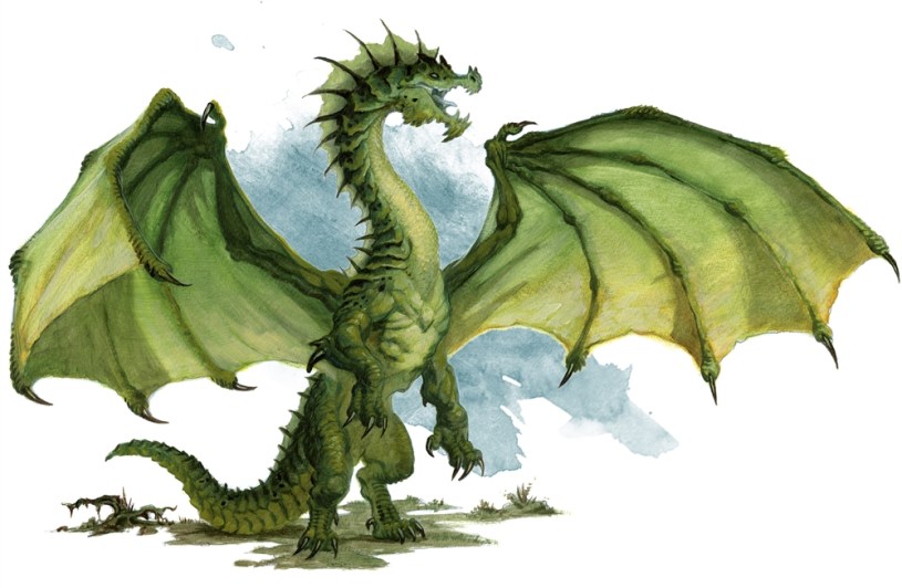 Voor de deur staat een grote, groene draak.
