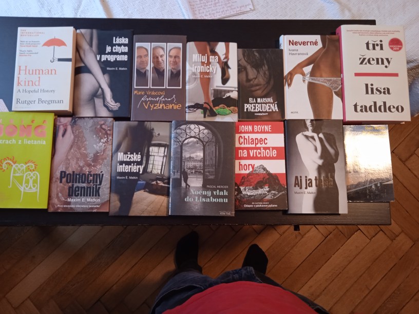The books I got at a Slovak book market. Got them at very decent prices. They were willing to bargain. The French book I got for free. The seller said nobody ever buys French books here. You can see a lot of romance books, well, that’s because I write quite a bit of romance myself and want to learn, learn, learn. The priest book and the Slovak version of Fear Of Flying are for Zuzi.