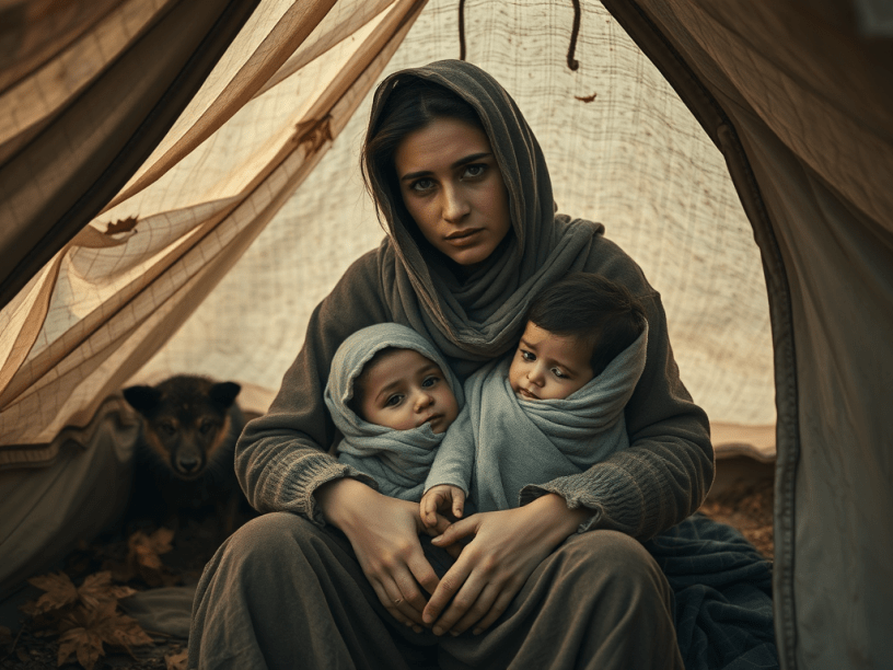 So you’re in a tent. You’re in your mid twenties. Last year you became a mother for the second time. Your husband was killed by a tank shell when he was out to get water six months ago. They only found his arm and his head. After he was hit the tank that killed him found it necessary to drive over him. The spot where he died looked like the ground of an abbatoir. Neither of you are politically involved. He was a fisherman before October 7th and you were a homemaker, in hip American lingo. You have two children. One is four and has stopped speaking entirely, even though before October 7th he talked non-stop, prattling commentary on anything he was doing while playing and firing off questions about whatever new thing he discovered. Now not a word. When a stranger comes near, he growls.