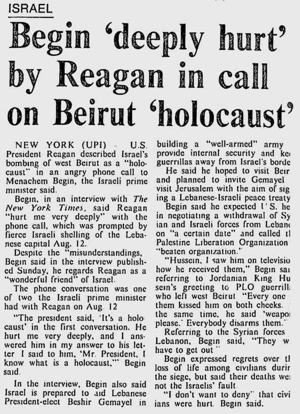 Israel used so much force Ronald Reagan called Israeli Prime Minister Menachem Begin to say the Israelis were creating a ‘holocaust’ in Lebanon. This displeased Begin enormously, since for some Israelis only one crime against humanity can be labeled as such. There is plenty of cruelty to go around in the world, but as we know now with even more certainty, only the Nazi Holocaust somehow trumps all other evil ever done in human history.