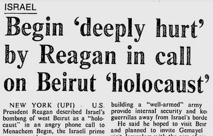 Israel used so much force Ronald Reagan called Israeli Prime Minister Menachem Begin to say the Israelis were creating a ‘holocaust’ in Lebanon. This displeased Begin enormously, since for some Israelis only one crime against humanity can be labeled as such. There is plenty of cruelty to go around in the world, but as we know now with even more certainty, only the Nazi Holocaust somehow trumps all other evil ever done in human history.